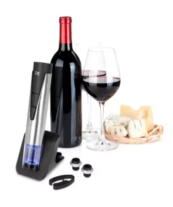 - Charging base stores a foil cutter and 2 wine bottle stoppers