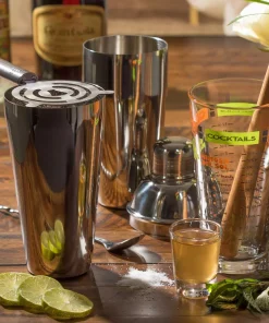 - Includes 1, 2-ounce shot glass; 1, 20-ounce mixing glass; 1 metal strainer; 1 wooden muddler; 1 metal stir spoon; 1 metal shaker base; and 1, 3-piece metal shaker