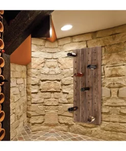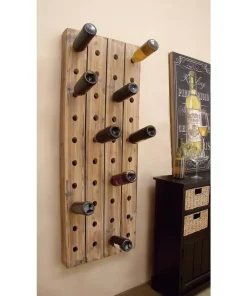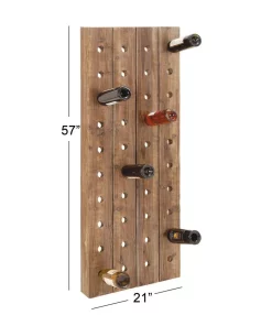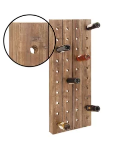 Display your wine in rustic style with this fashionable and functional reclaimed wood pegboard hanging wine rack⦠Wall-mount this wine rack to warm up a room with the beautifully detailed natural grain of the exposed light brown and soft mocha brown reclaimed fir wood planks. Four vertical rows of 10 holes each support up to 40 standard-sized wine bottles by their tops. The minimalist, rustic aesthetic of this pegboard wine rack elevates your rustic decor or farmhouse decor dining room, kitchen, or bar area. Use it to hold your wine bottles, or add empty, multi-colored glass bottles to create colorful and rustic DIY wall art!57ⳠFarmhouse rustic natural exposed wood-finish pegboard wine rack, exposed mahogany brown fir thick vertical planks with 4 vertical rows of 10 drilled holes, supporting 40 bottles, top first
