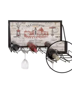 This 6-bottle wall mounted wine rack features a sturdy iron metal frame with suspended iron wire cradles and lower stem-glass iron wire rack designed to hold up to 6 regular wine bottles and 6 inverted wine glasses. The rectangular fir wood board of this wine rack is decorated with black and red vintage typography, illustrations and photo-realistic wine openers that add a touch of whimsy and an Old World charm to homes and spaces. The iron black and whitewash finishes of this wine rack add a rugged, rustic look.