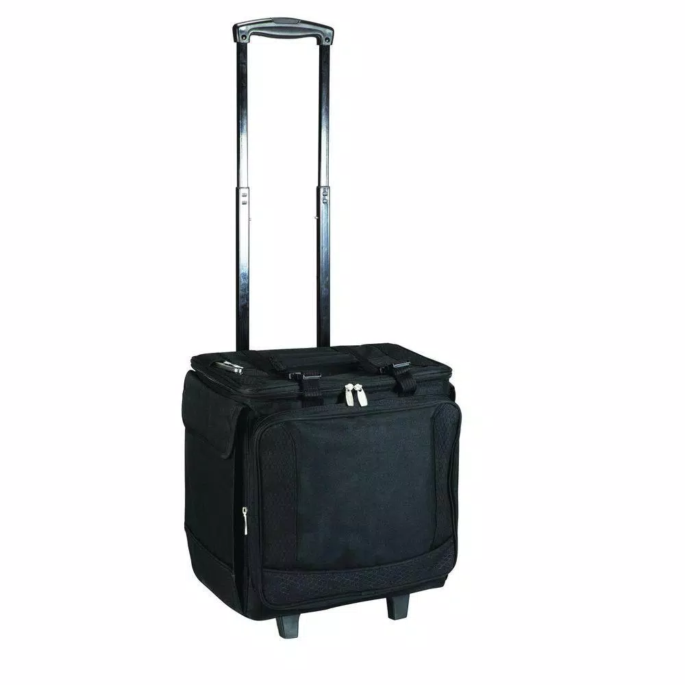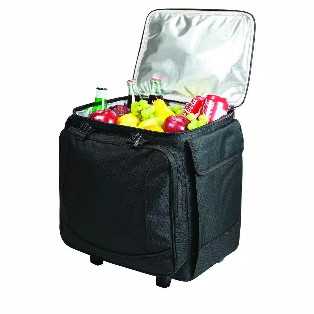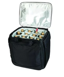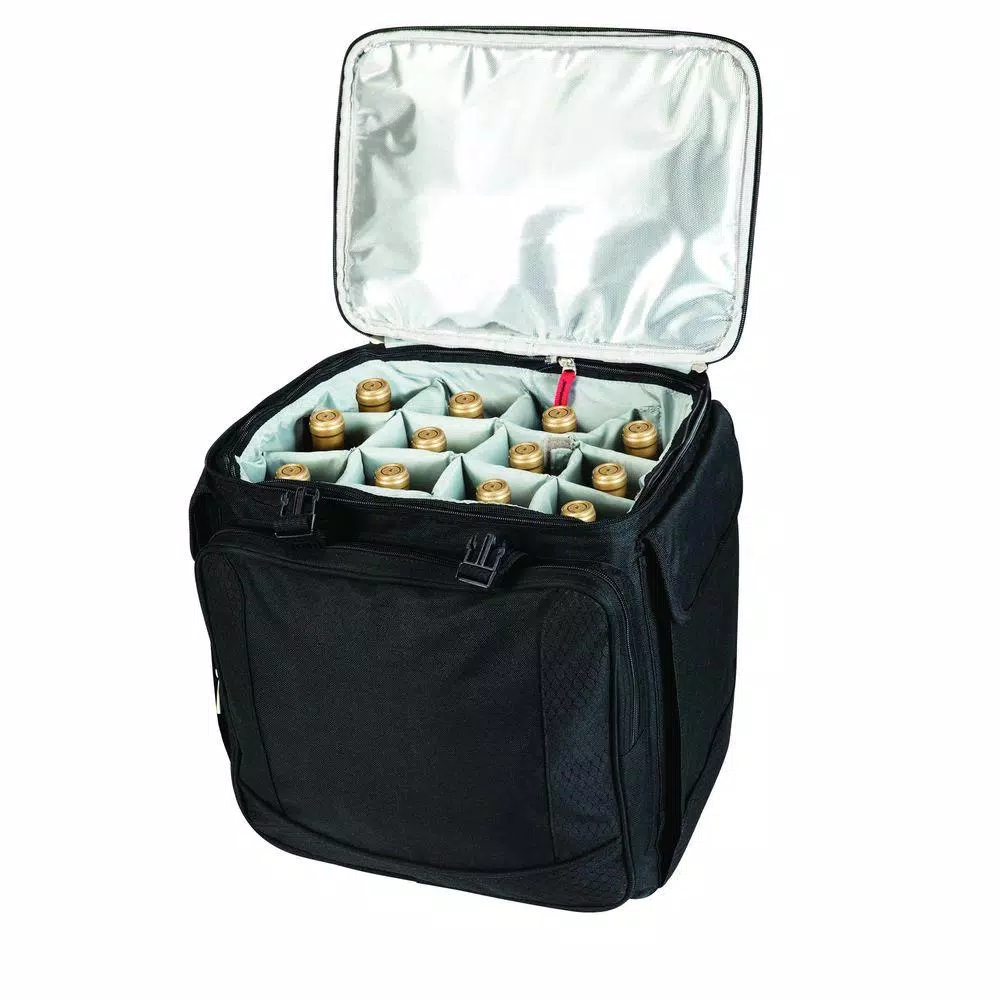 The Bodega is an insulated 12-bottle wine tote/cooler on wheels. It has a telescopic handle with push-button release and 3 large exterior pockets to fit 3-ring binders, brochures, magazines or other personal effects. Unzip the interior bottle divider from the interior cooler compartment and there’s a water-resistant liner underneath that converts the wine tote to a 40-can capacity cooler. Perfect for the beach or team sporting events. Made of polyester with a heavy-duty comfort grip top handle and 2 locking clasps to secure its contents, you can be assured the Bodega will protect and insulate your bottle beverages wherever you take it.