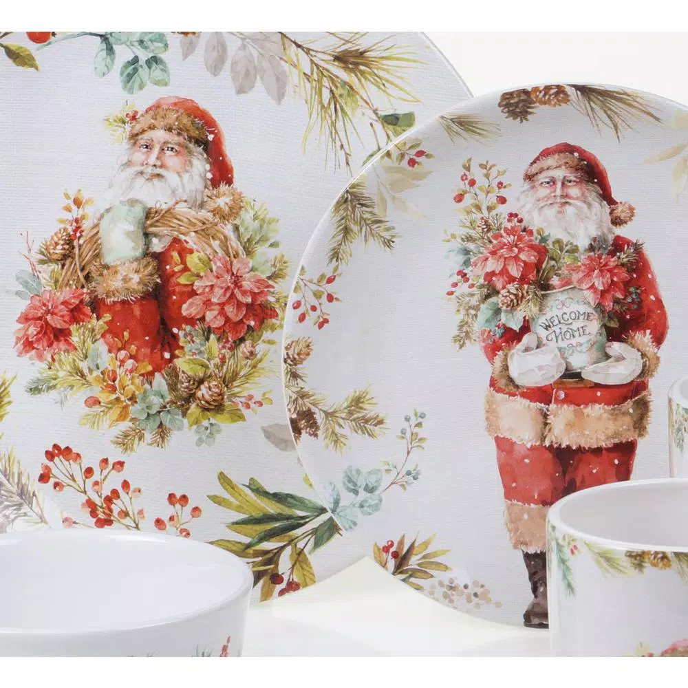 Enjoy the holidays with Certified International’s ” A Christmas Story” ceramic dinnerware and serveware collection from beautiful watercolor art by Lisa Audit. Featuring scenes of vintage Santas accented by red poinsettias and berries, these pieces can become the centerpiece of your family holiday traditions. The decorative yet functional 3-d Santa cookie jar, S and P set and poinsettia candy plate complete this lovely collection. Includes 4 -11 in. dinner plates, 4 – 9 in. dessert plates, 4 – 22 oz. mugs and 4 – 22 oz. ice cream bowls.