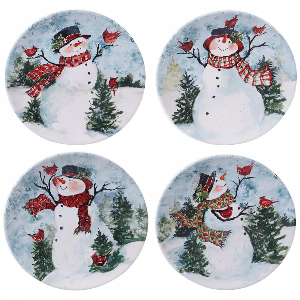 Certified Internationals Watercolor Snowman features colorful images of snowmen against a frosty, snowy sky as painted in watercolors by Susan Winget. These happy snowmen are joined by their red cardinal friends and are bundled up against the cold with plaid scarves and top hats. Add to the fun with our 3-D snowman cookie jar and S and P set.