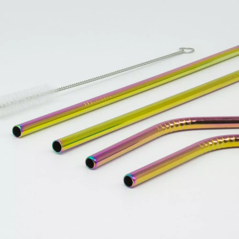 Bring with you this rainbow 10 piece reusable straw set that is the perfect tumbler companion! With this set you can sip on delicious hot or iced coffee, flavorful fruit juices, water, teas, and more. Included are 4 straight straws, 4 curved straws, and cleaning brushes. Constructed with stainless steel at a convenient 8.5 length to provide a durable and reliable product. Enjoy the eco-friendly benefit of reducing plastic straw use and helping the environment. Easy to clean and easy to use.