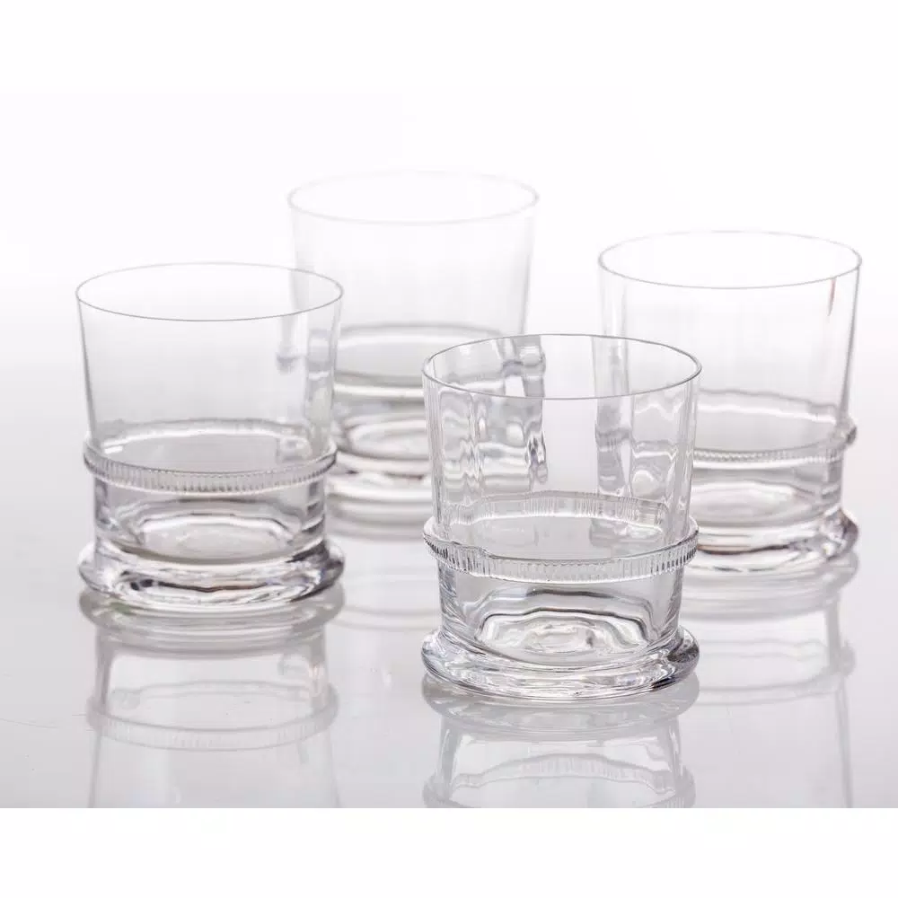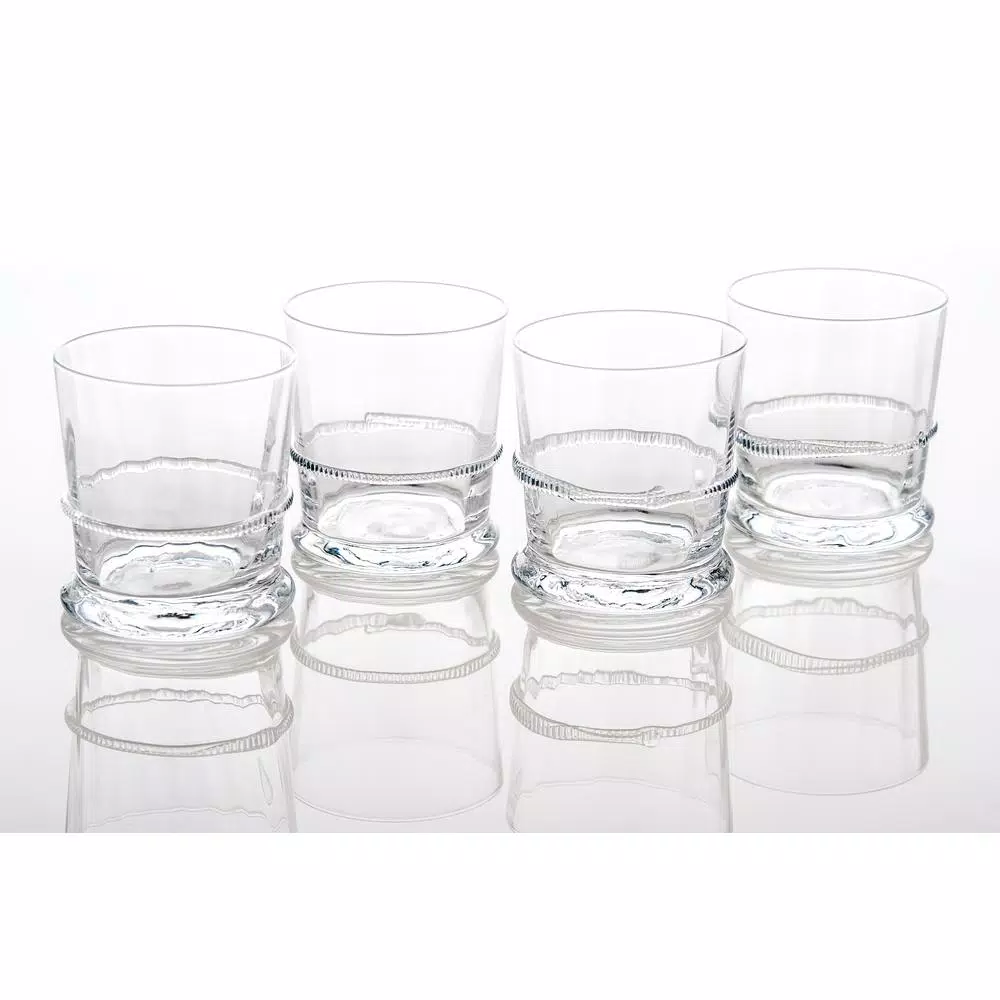 This is handmade glass at its very best. A distinctive hand applied glass rope is the detailing. The glass is clear with slight optic look. Set of four.