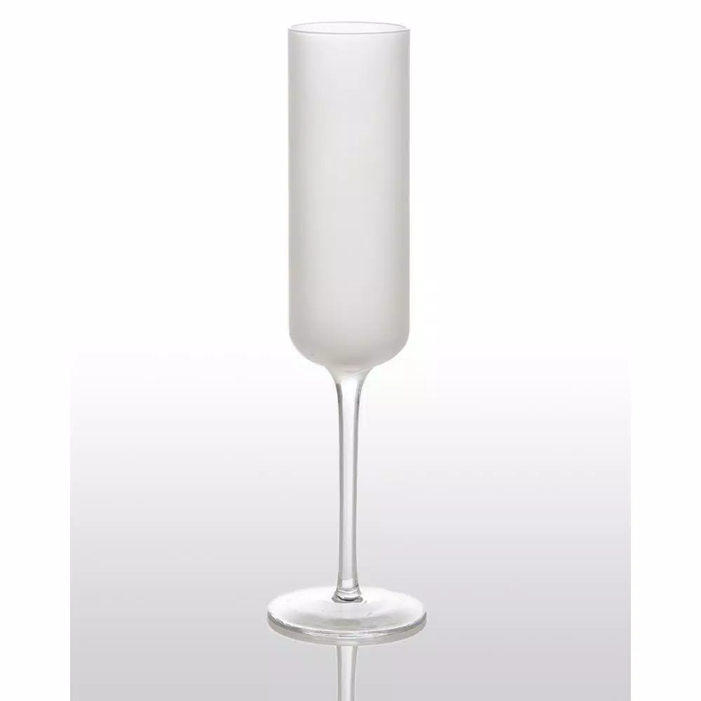 This is a sophisticated collection of table top glassware that includes a champagne, wine, and water glasses. A carafe and pitcher finish out this group of contemporary glassware of frosted and clear pieces. It is made in China.