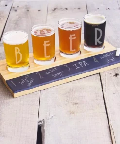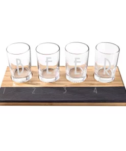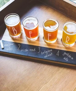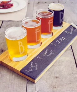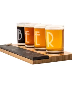 - Set included: 1 bamboo and slate flight board, 4 personalized 5.5 oz. beer taster glasses, and 1 piece of white chalk