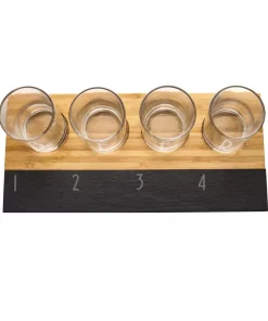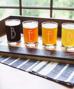 Serve and sample your local brewery’s preferred craft beers as well as international favorites with this Bamboo and Slate Craft Beer Tasting Flight. Each flight features a natural bamboo serving board with a numbered slate insert, and 4 thick-based taster glasses – laser engraved with a single, large letter on each to spell out the word “BEER”. These beer tasting sets are the perfect addition to any entertaining or barware collection.