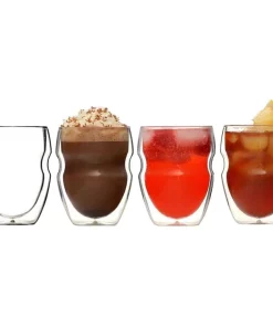 Made of durable, heat and condensation-resistant, mouth-blown borosilicate glass of the finest quality, the 8 oz. Serafino glasses are among the most popular glasses in the Ozeri Artisan Series of award-winning handcrafted drinkware. Each glass features an elegant double-walled design that suspends beverages within an inner wall for the ultimate insulation, preserving drinks at their ideal temperature. The Serafinoβs unique double-wall design creates an engaging optical effect, while the wraparound contour provides a natural aesthetic grip. Each glass is made to keep your hands cool even with your hottest drinks, and free of condensation with your chilled beverages. The patented Serafino glasses are great for coffees, cappuccinos, hot or iced teas, cocktails, frozen beverages and much more. Whether it is an occasion for a glass of wine, coffee, or some other beverage, borosilicate glass is completely resistant to acids, and your Ozeri glasses will never lose their original sheen. Each set contains 4 handmade glasses designed for lifetime use. The Serafino glasses are completely microwave and freezer safe, and ship in an elegantly printed and carefully packaged box with a No-Hassle warranty.