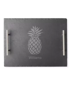 The Personalized Pineapple Slate Serving Board makes for a beautiful display of welcome in your home. Cut from slate with a natural edge, this distinctive serving tray features two stainless steel handles. It also has EVA feet to prevent sliding on any surface.