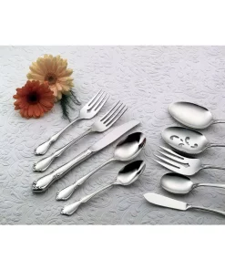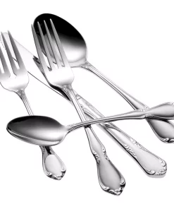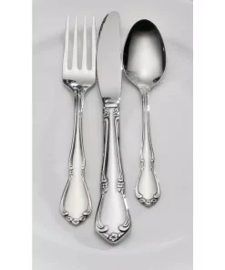 This timeless pattern boasts a traditional fiddleback shape accented by intricate scrolls, finely detailed flowers and a highly polished finish. Chateau flatware is well suited to complement decorative or plain dinnerware designs. This flatware set is made of 18/8 Stainless Steel and is dishwasher safe.