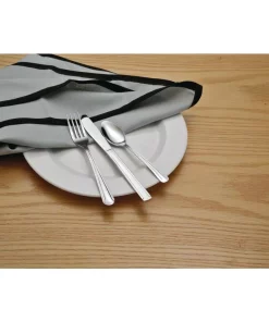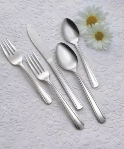 This design boasts a pair of prominent lines flowing down the middle creating a pleasing paneled effect. The brightly polished handle tapers at the shank bringing balance to this casual pattern. This flatware set is made of 18/0 Stainless Steel and is dishwasher safe.