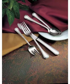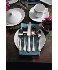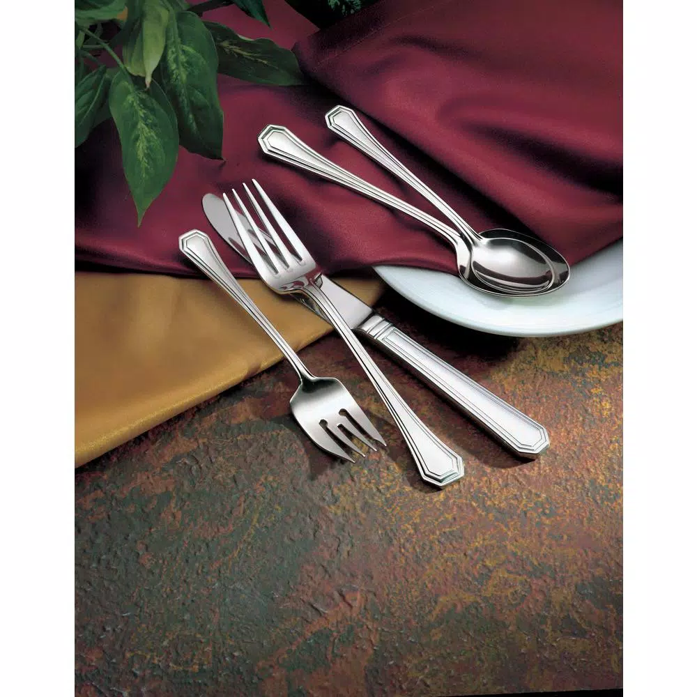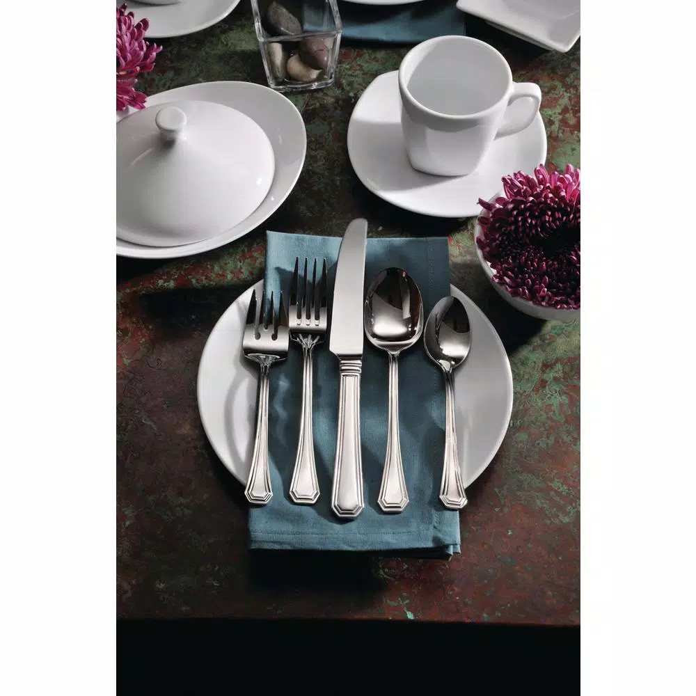 A pair of incised lines echo the perimeter of this luxurious design. The lustrous notched handle brings a contemporary, European flair to your fine dining establishment. This flatware set is made of 18/10 Stainless Steel and is dishwasher safe.