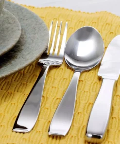 This beautiful 20 piece stainless steel flatware with mirror polish finish and hollow handles. Although hollow, the weight on the set is fully balanced. The wide handles on the set makes it comfortable in the hand. The set is beautiful and will stand out on the table. Your guests will ask you about the set and its gracious look on the table.