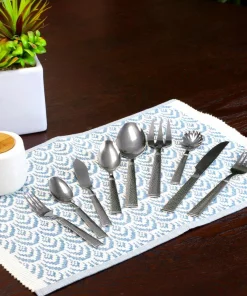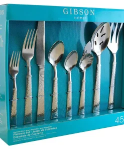 - Set includes: 8-dinner knives, 8-dinner forks, 8-dinner spoons, 8-teaspoons, 8-salad forks, 1-serving spoon, 1-slotted serving spoon, 1-serving fork, 1-butter knife, 1-sugar shell