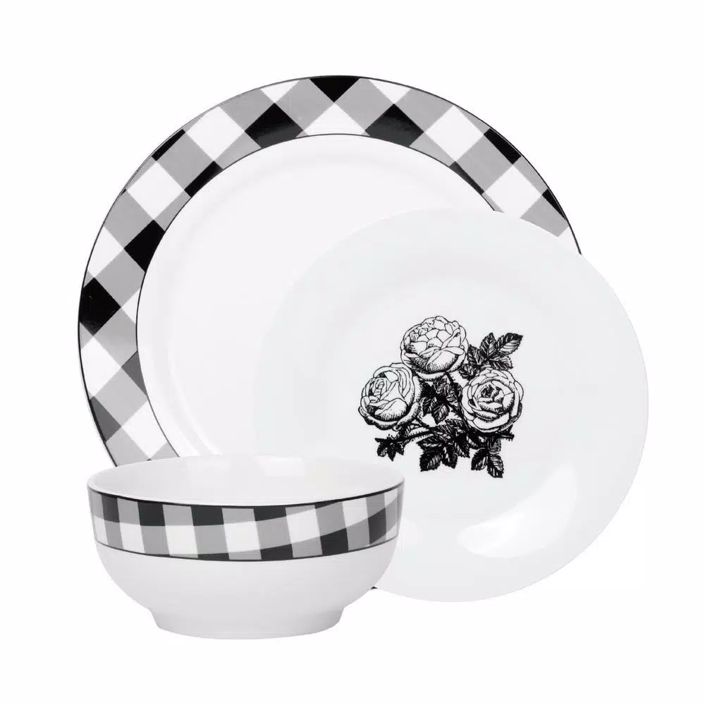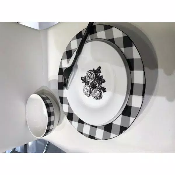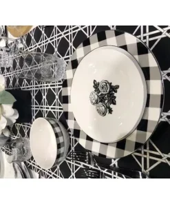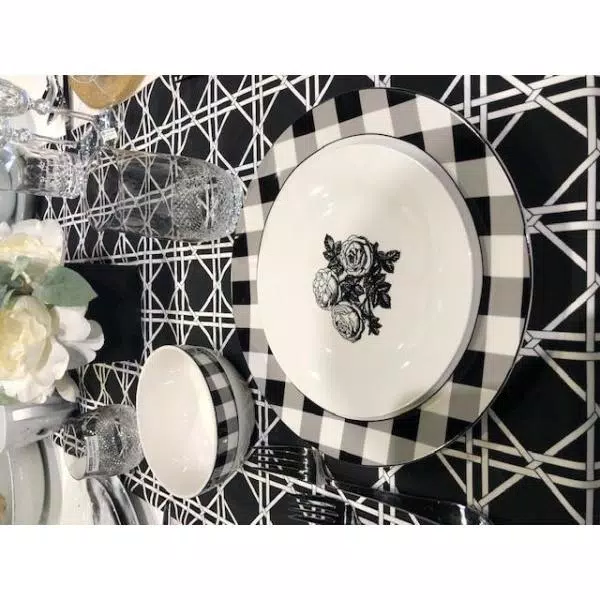 Beautifully crafted Damier 12-piece Black Checkerboard set made Beautifully crafted Damier 12-piece Black Checkerboard set made of fine Porcelain. Great for all events and occasions. These pieces are a perfect yet practical addition to all decor styles adding a fun flare to a classic piece. The Dinner plate has the Checkerboard design on the rim and the salad plate has the beautiful three roses design and together its pure elegance and yet so modern.
