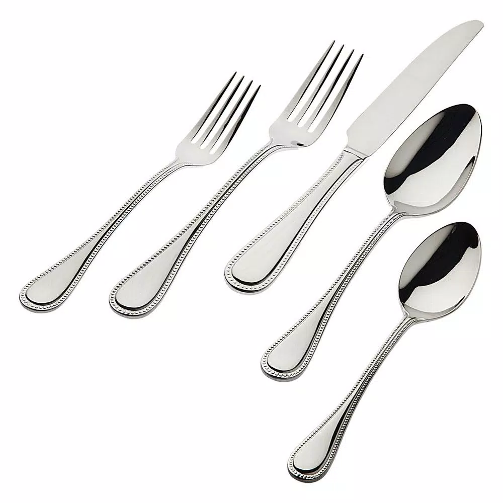 - 77-piece flatware set includes 12 of the following dinner forks, salad forks, dinner knives, dinner spoons, teaspoons, steak knives and one of each hostess, serving spoon, serving fork, butter spreader, sugar spreader, and one sugar spoon