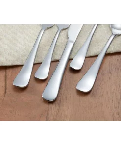- Dinner knife (8.9 in. long), dinner spoon (7.7 in. long), teaspoon (6.6 in. long), dinner fork (7.8 in. long), salad fork (6.6 in. long), solid serving spoon (9 in. long), slotted serving spoon (9 in. long), serving fork (9 in. long), butter knife (6.6 in. long), sugar spoon (6.2 in. long)