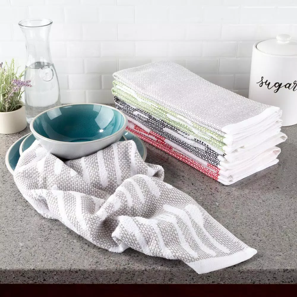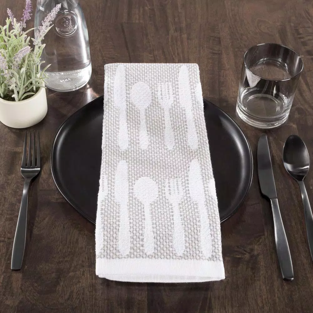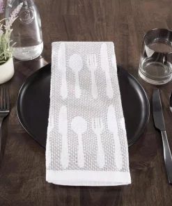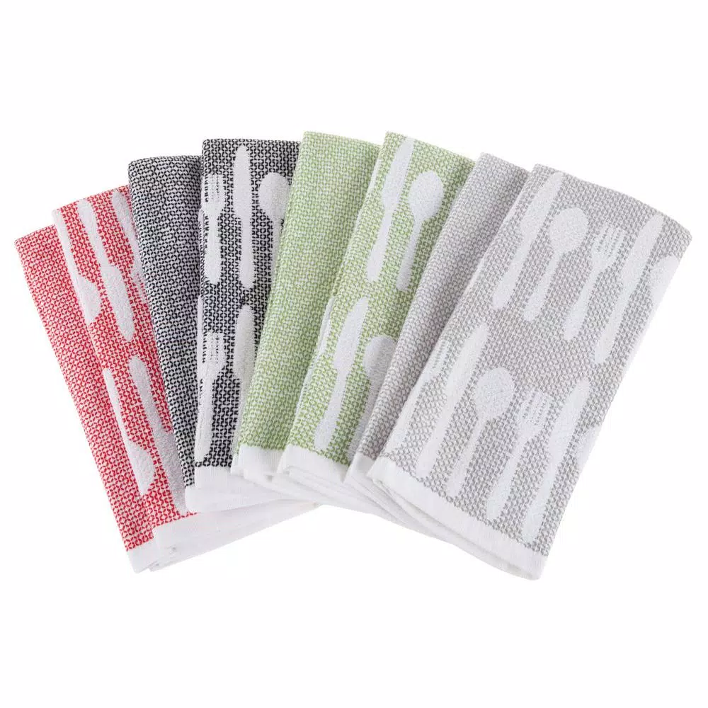 Add subtle elegance to your kitchen with the Multi-Color Flatware Design Chic Pattern Weave Cotton 8-Piece Kitchen Towel Set by Lavish Home. The set features a chic pattern weave with silhouettes of knives, spoons, and forks that creates an unmatched charm. Made of highly-absorbent cotton, the kitchen towel ensures quick and efficient drying of dishes and surfaces.
